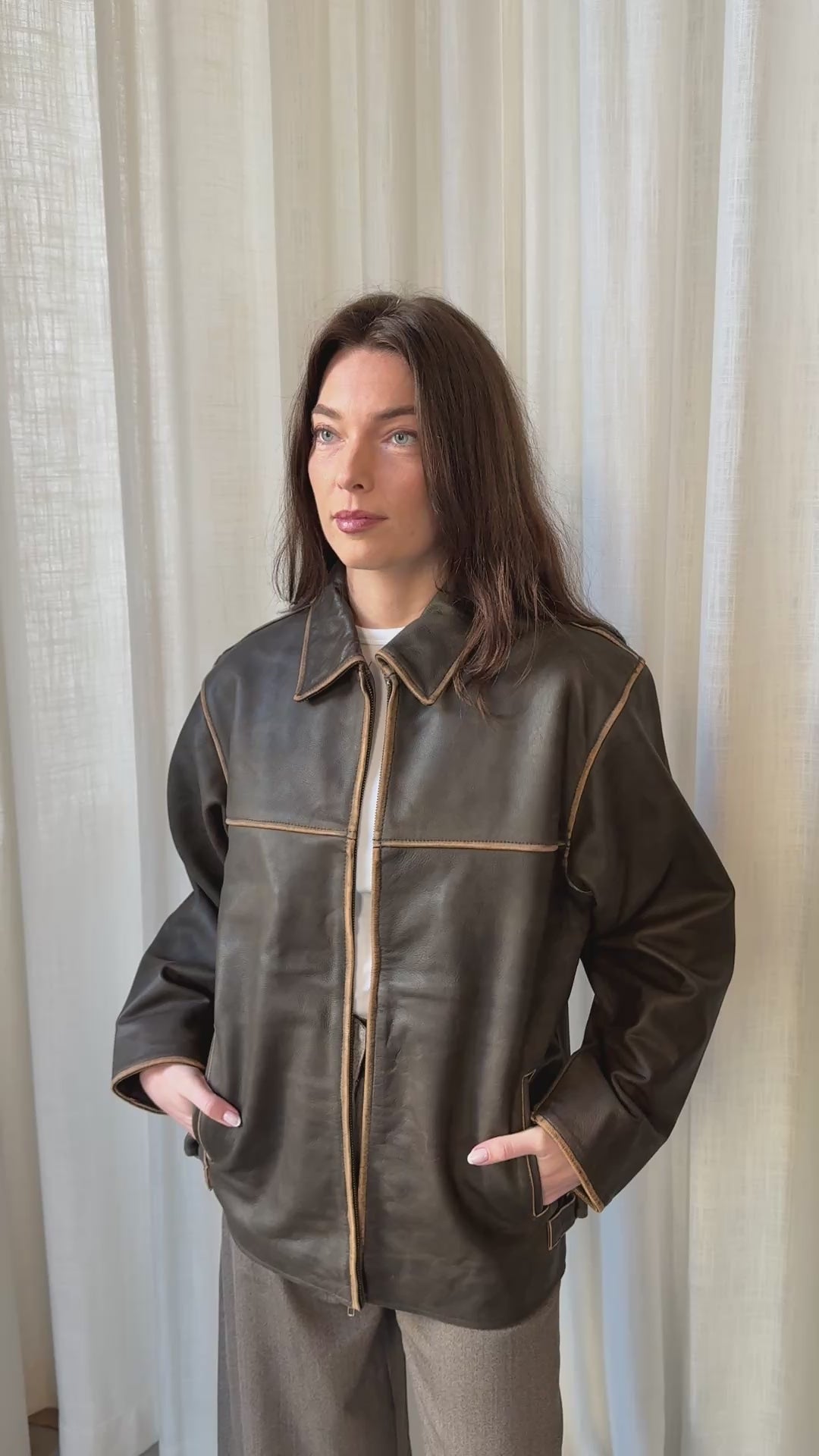The Brown Faded Jacket Sample is crafted from 100% upcycled leather, distinguished from the original Brown Faded Jacket by its deeper brown tone. The jacket is completely new and has never been worn.