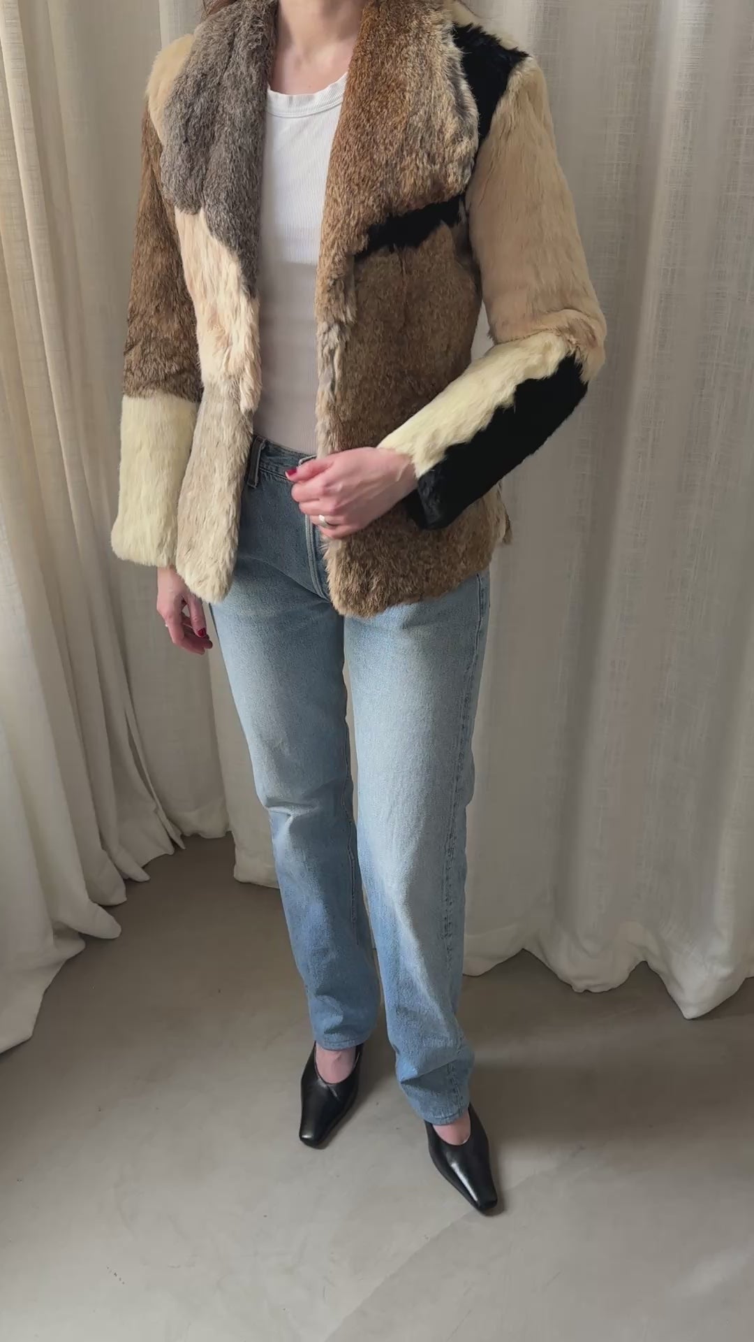 A statement patchwork fur jacket crafted from mixed panels in natural tones of cream, caramel, brown and black. Designed with a soft, structured silhouette and a classic collar, giving it a bold yet timeless feel.
