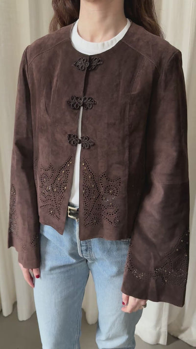 Dark brown suede jacket with a cropped, boxy silhouette and an open front design. Features decorative frog closures at the chest and subtle perforated detailing along the sleeves and hem, adding a refined yet distinctive touch.