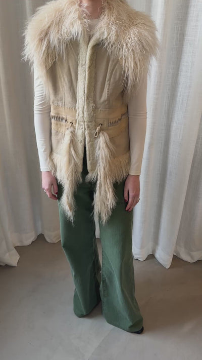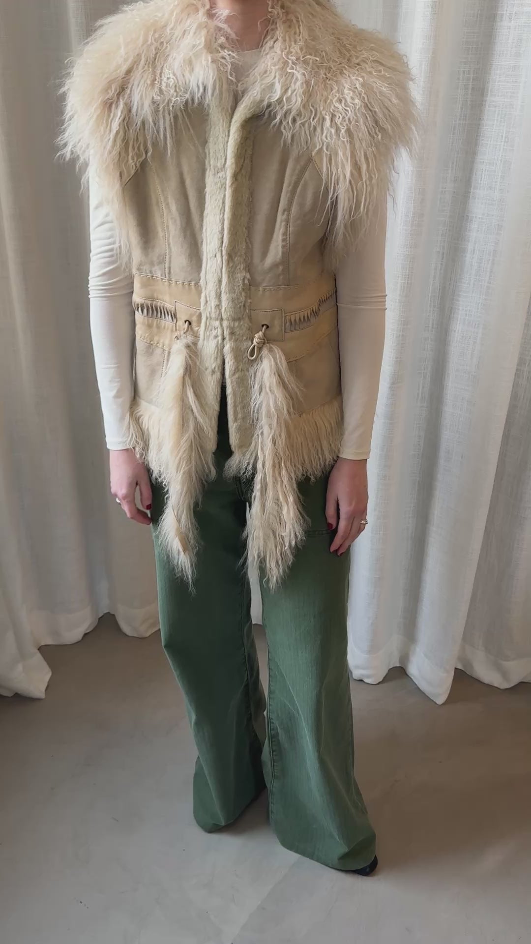 Beige shearling vest with a soft suede base and long, textured fur trim along the collar, front, and hem. Designed with a self-tie belt at the waist and a slightly elongated silhouette.