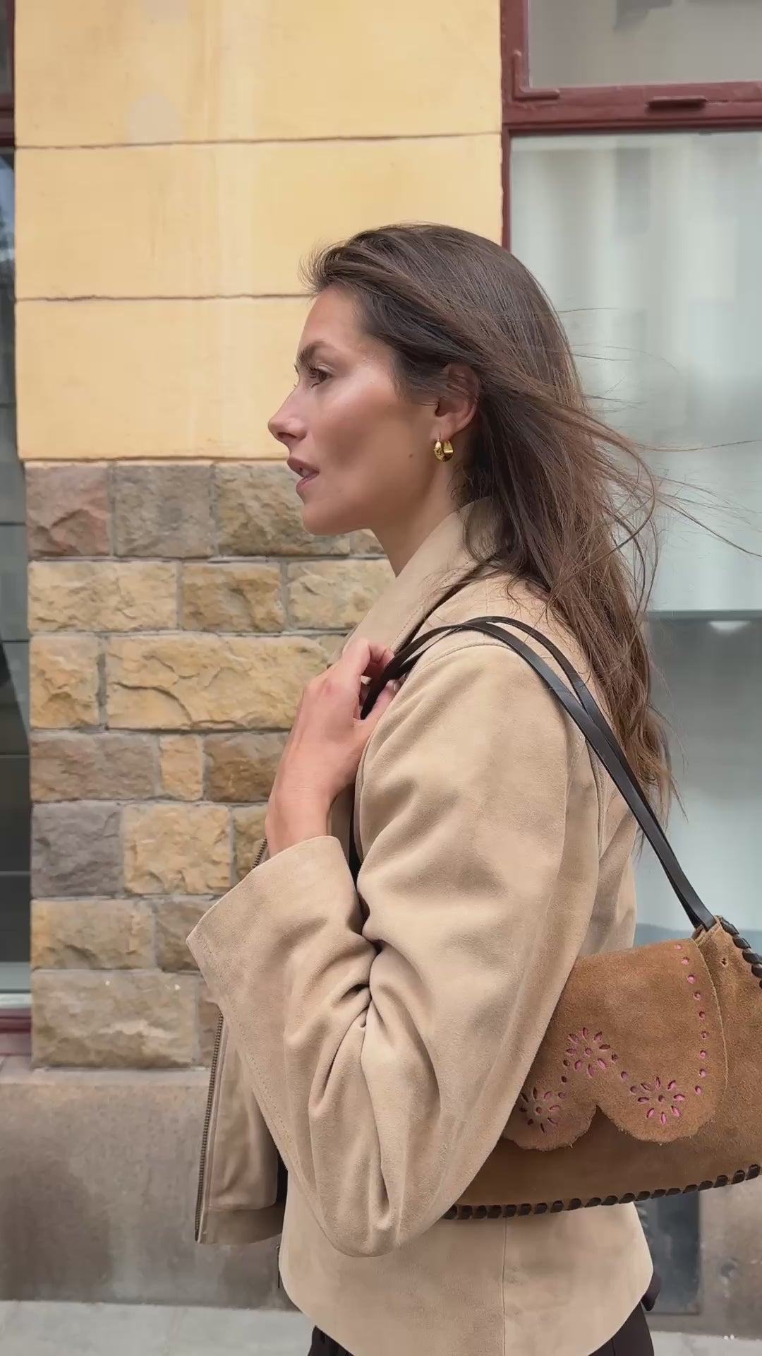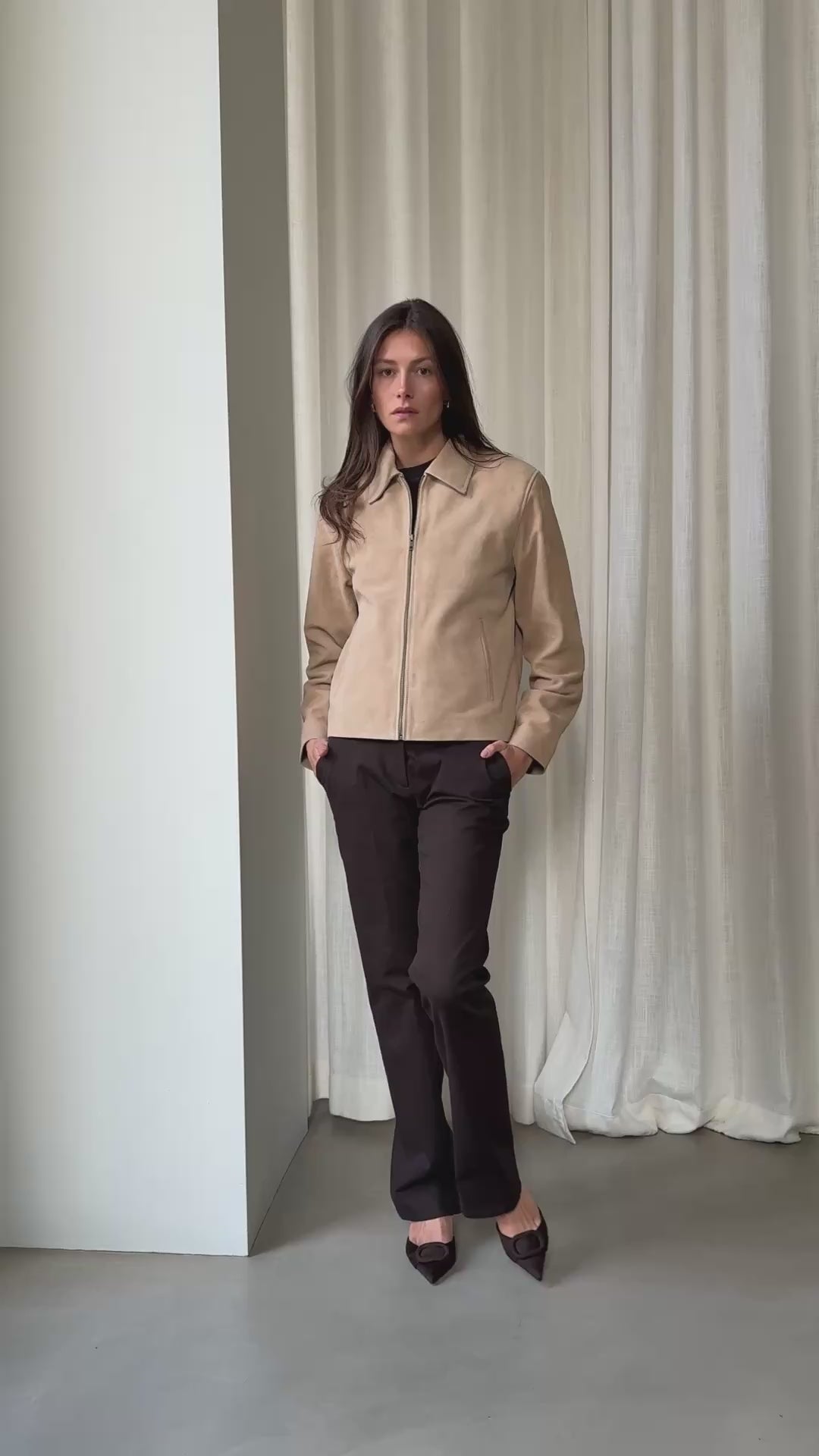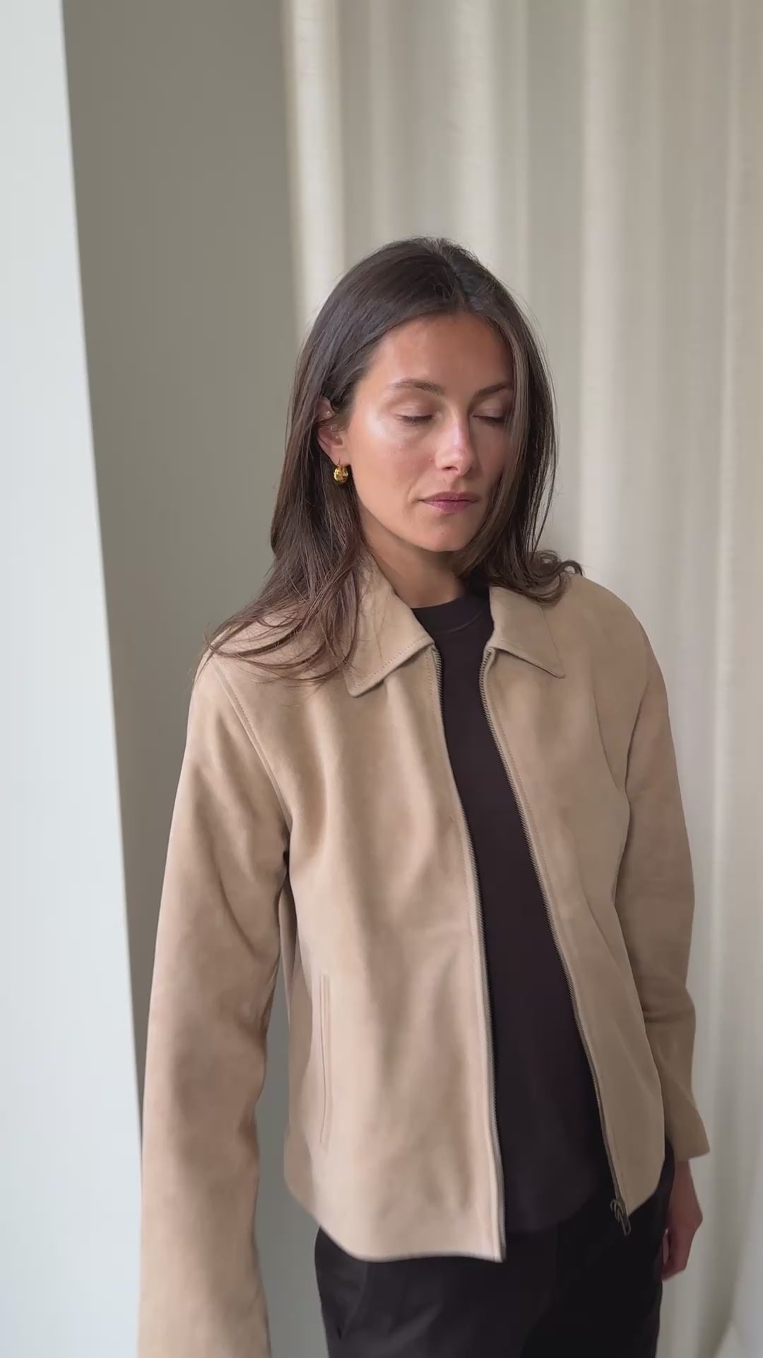 The Gaia jacket blends timeless style with a classic fit in a beautiful beige suede. With its clean design, it serves as a sophisticated addition to any wardrobe.
