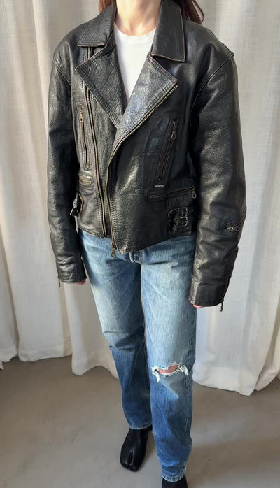 Leather jacket with a fitted silhouette and classic lapel collar. Designed with an asymmetric front zip and zip pockets. Cropped length with a structured, slightly edgy shape.