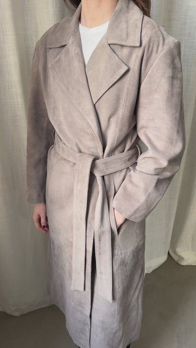 This is a sample coat in size M, crafted in soft suede with a light grey tone. Designed with a clean, mid-length silhouette, featuring a structured collar and a belt to define the waist. The suede has a smooth, refined finish that gives a minimal and elevated look.