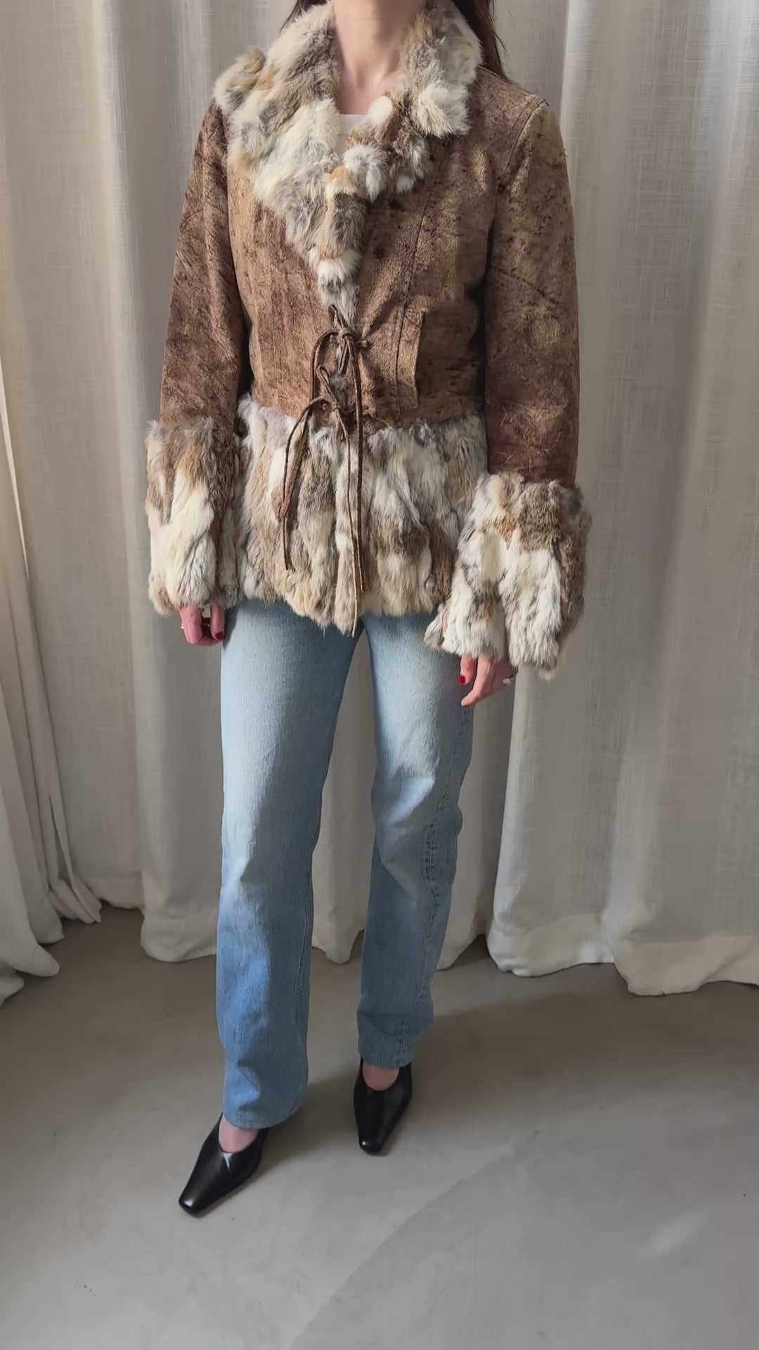 Brown suede jacket with soft lapin fur trim along the collar, front opening, hem and cuffs. Designed with a relaxed silhouette and tie-front closure. Textured suede exterior contrasted by plush fur detailing for a statement finish.