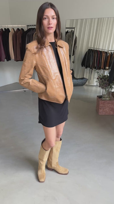 A light brown leather jacket in a tailored silhouette that follows the body. It features a sharp pointed collar, front zip closure and a minimal design that makes it easy to pair with both casual and more refined looks.