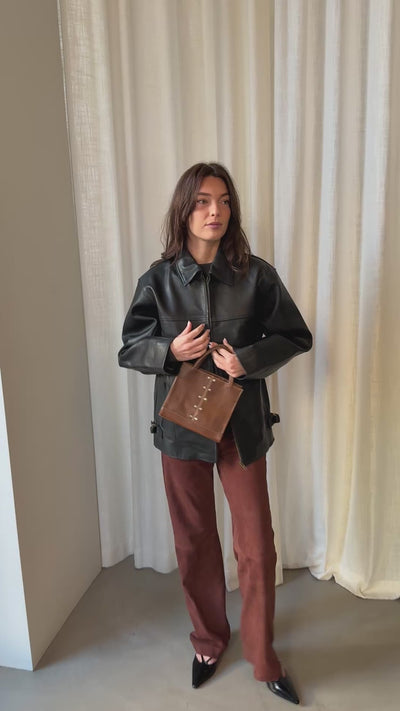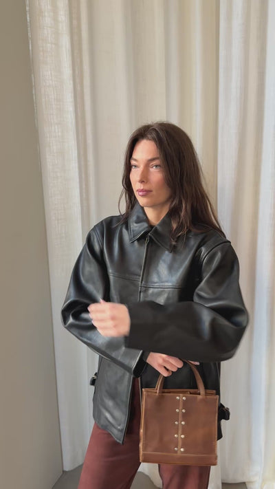 The Signature Jacket Sample is crafted from 100% upcycled leather, distinguished from the original Signature Jacket by its slightly thicker leather quality and a more subtle, natural shine. The jacket is completely new and has never been worn.