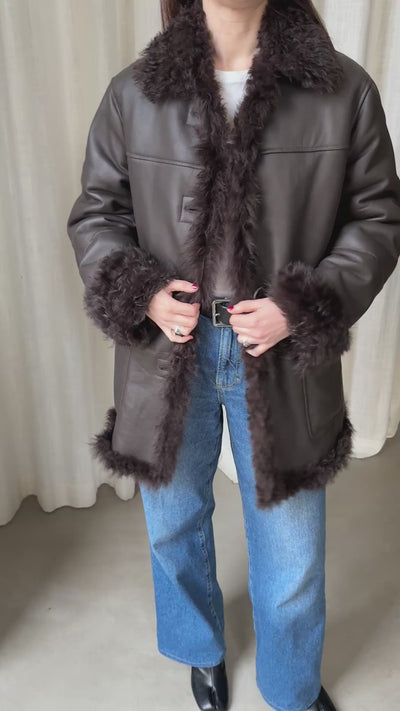 A shearling jacket crafted from real shearling fur, featuring a smooth leather exterior and a soft, natural fur lining. The design has a clean, timeless silhouette with shearling details along the front opening, collar and cuffs, giving both warmth and a refined finish.