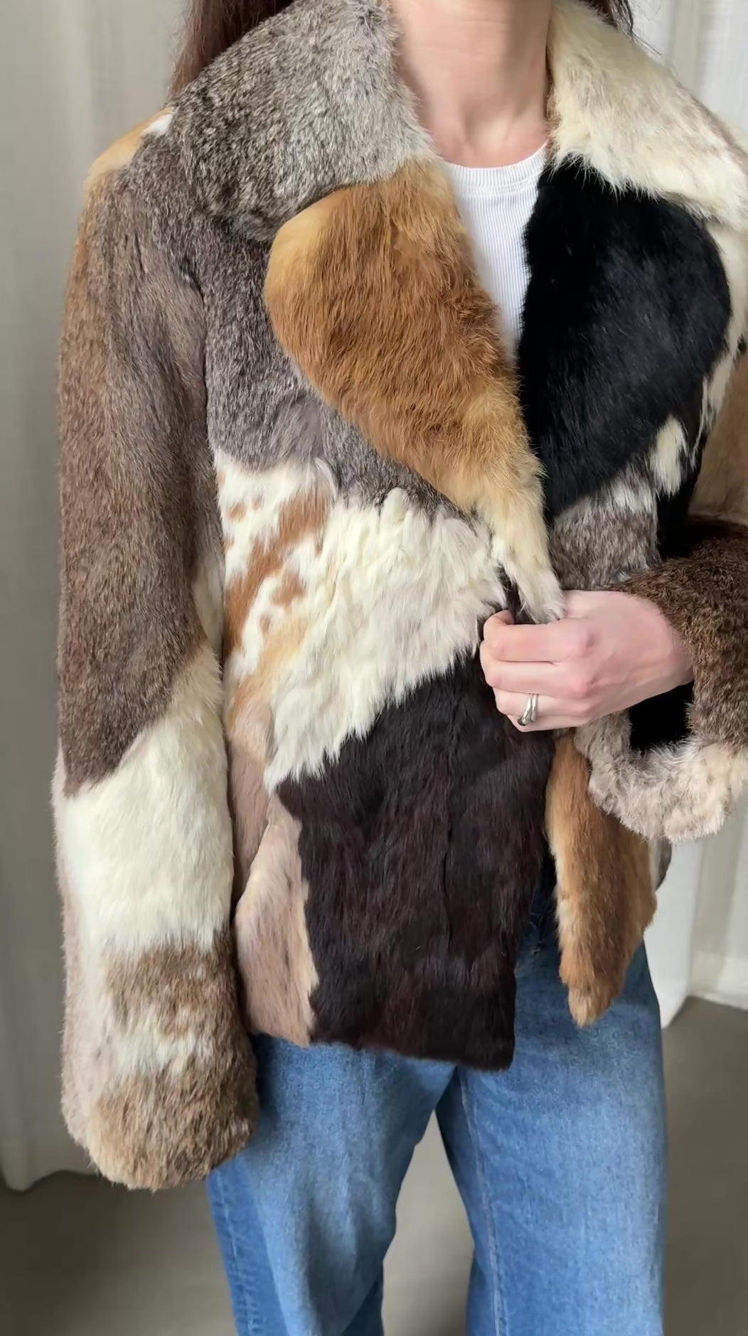 A statement patchwork fur jacket crafted from mixed panels in natural tones of cream, caramel, brown and black. Designed with a soft, structured silhouette and a classic collar, giving it a bold yet timeless feel.