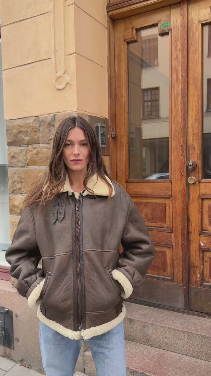 The vintage shearling jacket is crafted from genuine sheepskin with a soft fur lining. Designed with classic aviator details, it features a structured leather exterior that has developed a unique patina over time, contrasted by a plush interior that provides natural warmth. Has a small tear on the backside (see last picture)