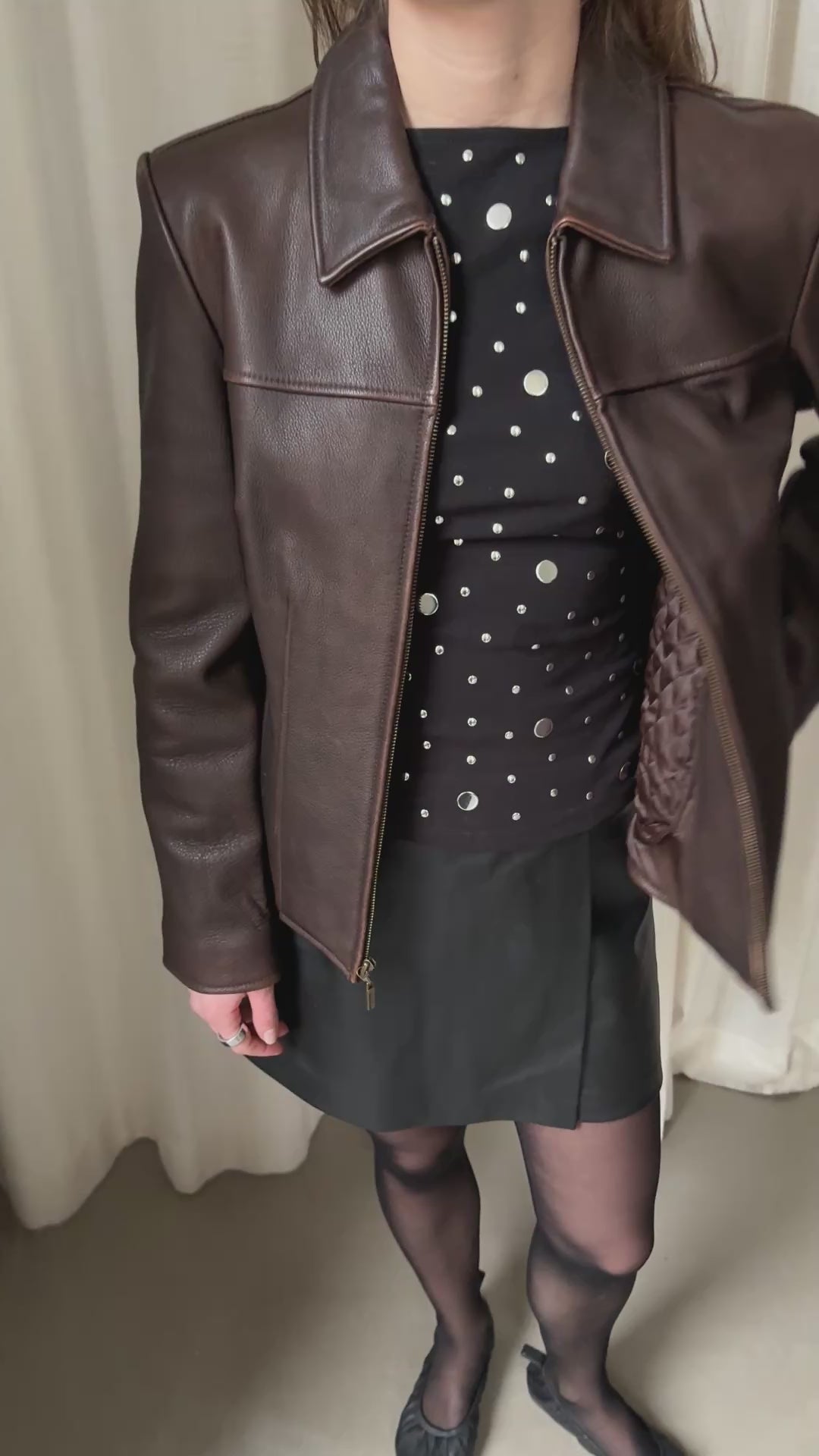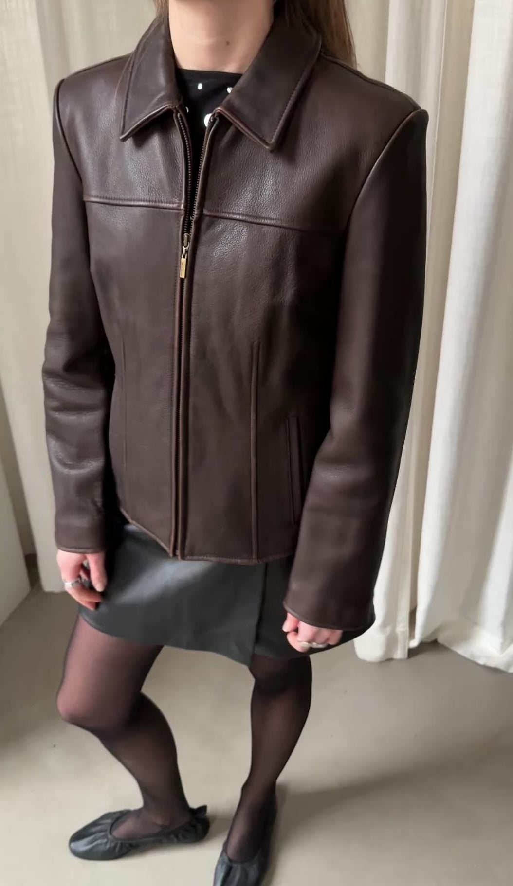 Brown leather jacket with a clean, straight silhouette and subtle panel detailing. Features a front zip closure and a classic collar. Soft leather with a smooth finish, easy to wear both dressed up or down.