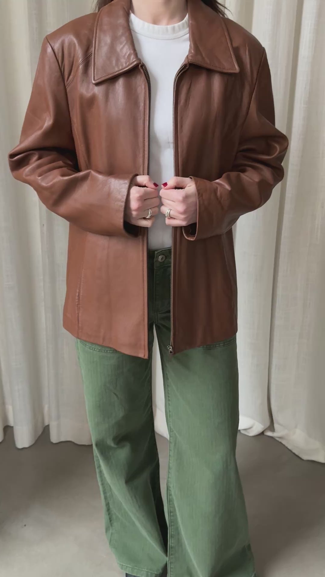 Vintage leather jacket in a warm brown tone with a clean, minimal silhouette. Straight fit with zip closure and classic collar. The leather shows visible signs of wear and subtle marks on the front, adding character and a lived-in feel.