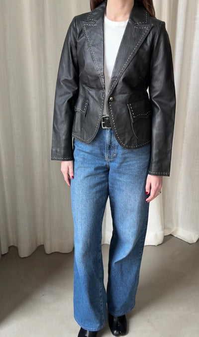 Black leather blazer with structured shoulders and contrast stitching throughout. Features front pockets, a classic collar.